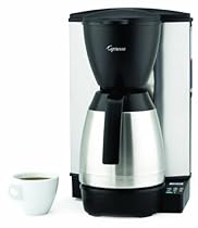 The Capresso MT600 coffee maker with stainless steel thermal carafe brews 10-cups of coffee in under 8 minutes for maximum flavor and aroma. The milled steel housing provides superior strength and style. 10-cup stainless steel thermal carafe with ergonomic handle brew-through closed lid with drip-free pouring spout keeps coffee hot for hours and preserves aroma. Stainless steel lined heating system eliminate contact with aluminum and reduces the need for decalcifying. The included gold tone filter is easy to clean and eliminates the need for paper filters. Drip stop allows you to pour a cup while brewing. Charcoal water filter removes up to 82-percent of chlorine and other impurities from tap water. One charcoal filter and holder is included. Illuminated 24-hour programmable lcd digital clock/timer with soft touch controls. Special setting provides maximum aroma when brewing 3-5 cups. An electronic filter indicator shows when to replace the charcoal filter. Electronics retain all programming during short power outages.