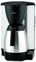 Jura-Capresso MT600 10-Cup Programmable Coffeemaker - 44501 The Capresso MT600 coffee maker with stainless steel thermal carafe brews 10-cups of coffee in under 8 minutes for maximum flavor and aroma. The milled steel housing provides superior strength and style. 10-cup stainless steel thermal carafe with ergonomic handle brew-through closed lid with drip-free pouring spout keeps coffee hot for hours and preserves aroma. Stainless steel lined heating system eliminate contact with aluminum and reduces the need for decalcifying. The included gold tone filter is easy to clean and eliminates the need for paper filters. Drip stop allows you to pour a cup while brewing. Charcoal water filter removes up to 82-percent of chlorine and other impurities from tap water. One charcoal filter and holder is included. Illuminated 24-hour programmable lcd digital clock/timer with soft touch controls. Special setting provides maximum aroma when brewing 3-5 cups. An electronic filter indicator shows when to replace the charcoal filter. Electronics retain all programming during short power outages. Features: 10-cup programmable coffeemaker with stainless-steel-lined heating system Illuminated 24-hour LCD digital clock and timer; soft-touch controls Brew-pause function; 2-hour auto shut-off for safety; cord storage Includes stainless-steel thermal carafe gold-tone filter and charcoal water filter Specifications: Color: Black and silver Capacity: 10 cups Built-in water filter: Yes Timer: Yes Auto shut-off: Yes Removable water tank: No Built-in grinder: No Pause-and-serve function: Yes Cup warming plate: No Cord storage: Yes Included accessories: Stainless-steel thermal carafe washable gold-tone filter and charcoal water filter Approximate Dimensions: Height: 14" Width: 8" Depth: 9" Approximate Weight: Unit: 9 lbs Shipping: 10 lbs Warranty Information: Manufacturer's Warranty (Authorized Online Retailer): 1 Year Limited...[]More detail ...