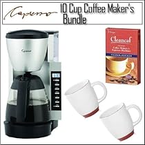 The Capresso CM 200 Programmable Coffee Maker brews 10-cups of coffee in under 9-minutes for maximum flavor and aroma and has a special setting for maximum flavor and aroma when brewing 3 to-5 cups. CM200 features a 24-hour programmable digital clock/timer with illuminated LCD display. Electronics retain all programming during short power outages up to 10-seconds. Swing-out coffee filter holder with GoldTone Filter (included) which eliminates the need for paper filters and is easy to clean. Drip Stop allows you to pour a cup while brewing. See-through removable water tank with water level indicators and Charcoal Water Filter to remove up to 82-percent of chlorine and other impurities from tap water (filter holder and one charcoal filter included). An electronic filter indicator on the display panel shows when to replace the charcoal filter. 10-Cup Glass Carafe features ergonomic handle brew-through lid and drip-free pouring spout. Non-stick warming plate concealed cord storage and 2-hour safety shut-off.
