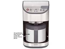 Attractively housed in brushed stainless steel this 10-cup coffeemaker not only looks great on the counter but it also provides an array of convenient features. Enjoy easy reading and programming thanks to its uniquely angled upward-facing control panel and LCD screen with a high-contrast black-on-white display. In addition dual auto-on presets make it possible to wake up to the smell of freshly brewed coffee before work in the morning as well as at a later time when sleeping in on the weekends. A sturdy 10-cup double-wall thermal carafe comes included complete with a plastic lid generous stay-cool handle and drip-free spout for graceful serving.Features:An "aroma" program for brewing smaller batches of coffeeAn oversized showerhead for improved extractionA push-button soft-open lid and auto-lift brew basket"Duo-filter" water filtration: removes unwanted flavors from your water and protects and promotes long life and great tasteAutomatic shut-off for safety